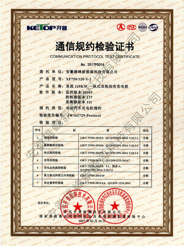 熱烈祝賀安徽雄峰新能源科技有限公司充電樁產品順利通過中電協繼電保護及自動化設備分會技術標準中心、許昌開普檢測技術有限公司及國家職能微電網控制設備及系統質量監督檢驗中心檢測,并獲得產品檢測證書及檢驗報告!