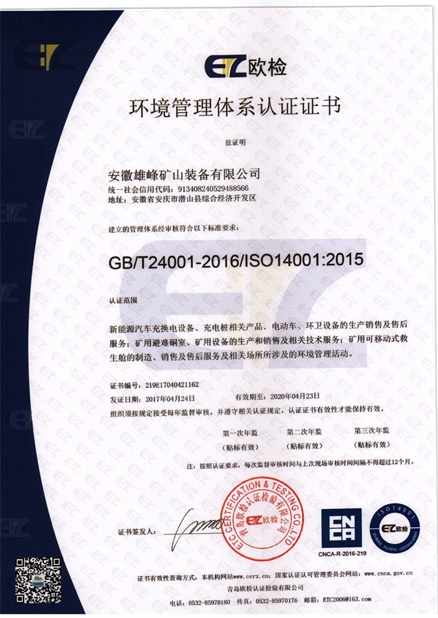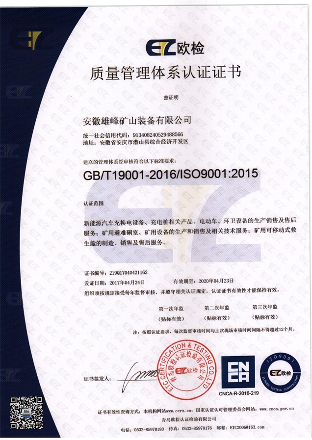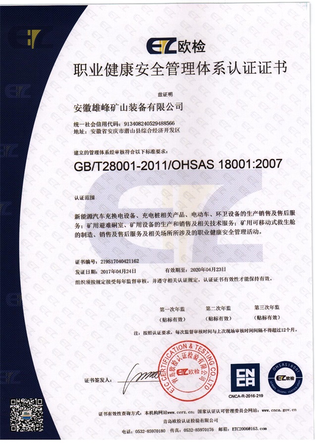 安徽天柱雄峰機電有限公司隸屬于安徽雄峰集團,公司座落在國家5A級風景名勝區--天柱山腳下,是一家專業從事研發、生產、銷售礦山機械、礦用安全設備、機電設備及國際貿易的現代高新技術企業。公司被評定為國家科技部創新基金項目和國債項目重點支持單位、安徽省優秀創新型企業。公司擁有省級企業技術中心和2個研究所,并與中國電子科技集團合肥38研究所建立戰略合作關系。公司引用中國航天技術,研發生產的礦用可移動式救生艙和避難硐室可以在礦井發送事故后,為無法及時撤離的礦工提供安全的避難和等待救援的場所。該產品經過模擬災變環境下真人106小時的生存試驗、高溫試驗、爆炸試驗等環節的檢測,已取得國家礦用產品安全標志證書,具備國際領先技術;且已取得專利23項,其中兩項發明專利(大型密閉門新型專利、逃生裝置新型專利)。公司秉承“誠信贏得市場,創新引領未來”的經營理念,在“瞄準高精尖,面向全球化”的發展戰略指導下,依托雄厚的科技力量和人才優勢,致力打造一流的礦用安全裝備,保障礦工生命安全,共建人類幸福家園!